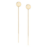 The CARA Threaded Earrings feature 10mm round discs with a 2" thin chain to comfortably thread through your ear. It is intended to sit against the earlobe like a stud earring with the 2" chain hanging behind the ear.