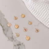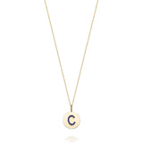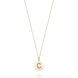 The 14K KARI initial diamond medallion necklace features a 1/2" medallion with a raised diamond initial in the center.