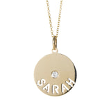 The ELAVA NAME CHARM features a cutout name around the perimeter with a handset diamond in the center hung on a dainty cable chain.