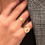 The KARI Diamond Initial Oval Signet Ring features a raised diamond initial in the center of the ring.