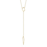Lariat features two coordinating geometric shapes measuring 5/8" and 1.25" respectively. Necklace measures 16"-18" with a 5" drop. Available in plain and diamond styles.