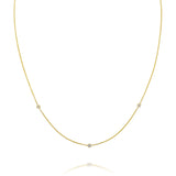 Necklace features three bezel set diamonds. Option to choose between the small size which features diamonds measuring 2.4mm (.05ct for a .15ct. total weight) or the large size which features diamonds measuring 3mm (.10ct for a .30ct total weight). Hung on a dainty 15"-16" cable chain.