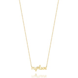 This dainty cutout text necklace features the word "MY ♥ LOVE" in lowercase custom script font.