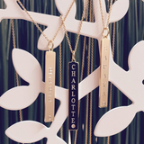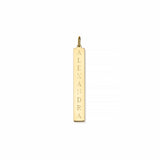 DETAILS: Part of the LEIGH bar collection, this pendant measures 1.5" long and 1/4" wide and features uppercase block text engraved in a vertical alignment. Option to feature a .01ct. handset diamond at the bottom as shown on sample. Cable Chain measures 16"-18"
