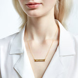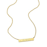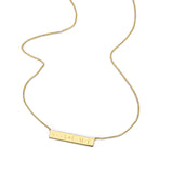 DETAILS: LEIGH ID Bar measures 1.25" long and 6mm high. Hangs on a 16"-18" chain. Choice of lowercase, uppercase block or script engraving. Symbols such as ♥, +, &, =, ▪ Roman Numerals, Coordinates, Numbers, Dates can be engraved.