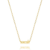 Name measures 6mm in height and approximately 3/4"-1" in width depending on the letters. Letters are dainty for a minimalist vibe. Available in Cable Chain and Open Link Chain styles.