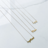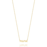 This dainty cutout text necklace features the word "mama" in lowercase custom script font.