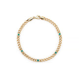 DETAILS: The RILEY 5-stone bracelet features five bezel set emeralds totaling 1/3ct. Curb chain cracelet measures 6.5" in length and 3mm in width.
