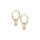 DETAILS: Gold Hoop earring measures 12mm round and features a hinged design for easy wear. Earring features your choice of a bezel set 3mm (.10ct) genuine birthstone. Earring is sold as an Earring Single. To purchase a pair, please add 2 units to the cart.